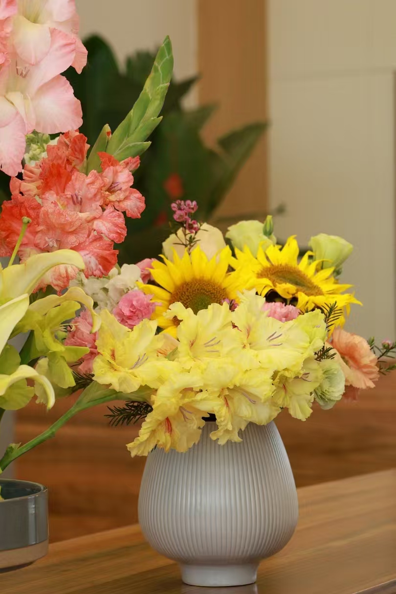 專業(yè)花藝師從色彩搭配、造型設(shè)計到花材養(yǎng)護(hù)展開生動講解,將插花藝術(shù)與生活美學(xué)娓娓道來。女職工們化身“春日造夢師”,修枝剪葉、構(gòu)思層次,指尖流轉(zhuǎn)間,原本零散的花材逐漸煥發(fā)新生。有人將玫瑰與康乃馨編織成古典花甕,盡顯端莊大氣;有人以向日葵搭配綠植打造田園風(fēng)花籃,充滿生機(jī)活力。現(xiàn)場歡聲笑語不斷,四十余件作品或清雅秀麗,或熱烈奔放,宛若一首首無聲的春日詩篇。