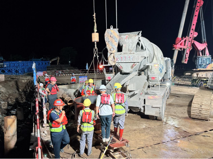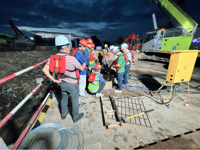 在施工現(xiàn)場,建設(shè)團(tuán)隊(duì)嚴(yán)格依照標(biāo)準(zhǔn)化施工流程推進(jìn)作業(yè)。從施打鋼護(hù)筒筑牢基礎(chǔ)防線,到旋挖機(jī)精準(zhǔn)鉆孔;從初次清孔、鋼筋籠精準(zhǔn)下放,再到安裝導(dǎo)管、二次清孔,直至完成水下混凝土澆筑,每一個(gè)環(huán)節(jié)都經(jīng)過精密測算與嚴(yán)格把控。過程中,建設(shè)單位園區(qū)公司、監(jiān)理單位、施工單位三方組成專項(xiàng)攻堅(jiān)小組,全程駐守現(xiàn)場,通過技術(shù)交底、實(shí)時(shí)監(jiān)測、動態(tài)調(diào)整,全力確保澆筑過程萬無一失。